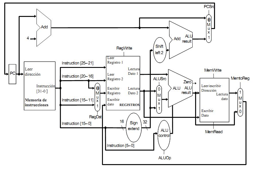 En artículos anteriores vimos los diferentes tipos de instrucciones que teníamos y los caminos de datos de estas, hoy veremos las señales de control que permiten que un procesador pueda realizar múltiples instrucciones diferentes sin tener que realizar las modificaciones que fuimos haciendo en el anterior artículo. De base tomaremos el siguiente diagrama: